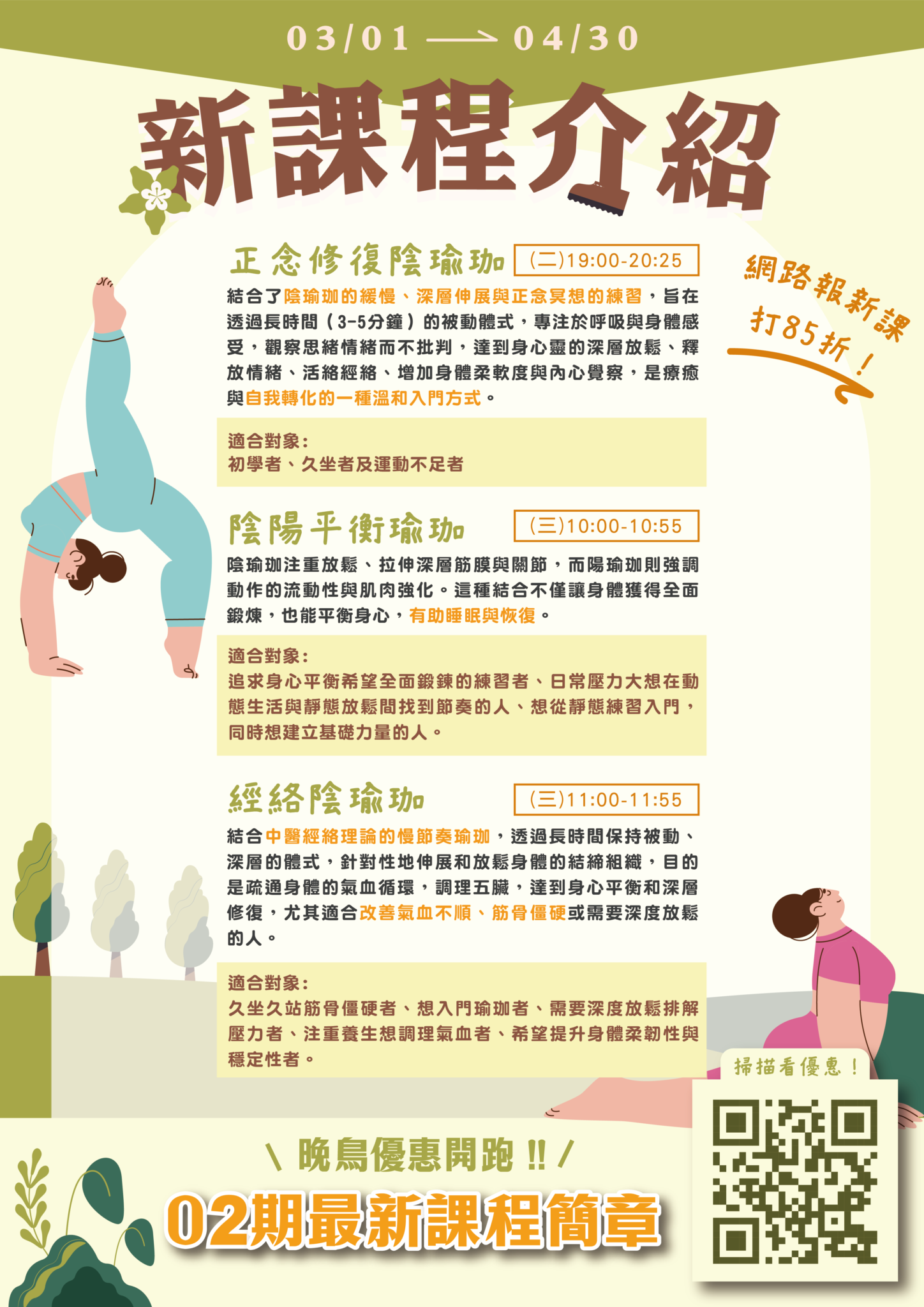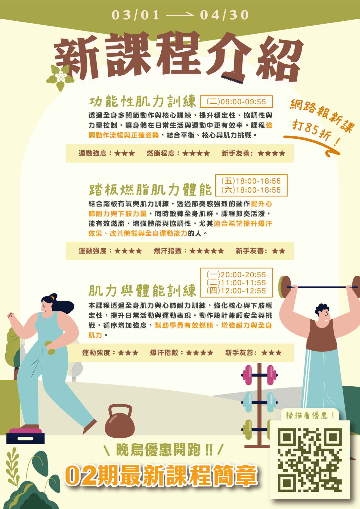 25 days ago 宜蘭國民運動中心 in 最新消息 332 新年報新課 讓身體狀態煥然一新 新課網路報名享85折 百元體驗課倒數中 晚鳥優惠2/13-2/26 |優惠一|兩人團報9 折 |優惠二|四人團報85折 |優惠三|網路新課85 折 (限線上繳費) #線上刷更划算 期課該如何報名 中心一樓服務台臨櫃報名繳費 多元支付方式:現金/信用卡/Apple Pay/臺灣Pay 官網線上報名 ► https://reurl.cc/8WY4Ro ►期別選擇「11502」 ►刷卡完成報名 百元體驗課2/8-2/14 先體驗後報名雙月期課享有 #88折優惠 更多優惠規則請詳閱簡章DM 線上簡章 https://pse.is/8p82le 中心專線03-925-4566