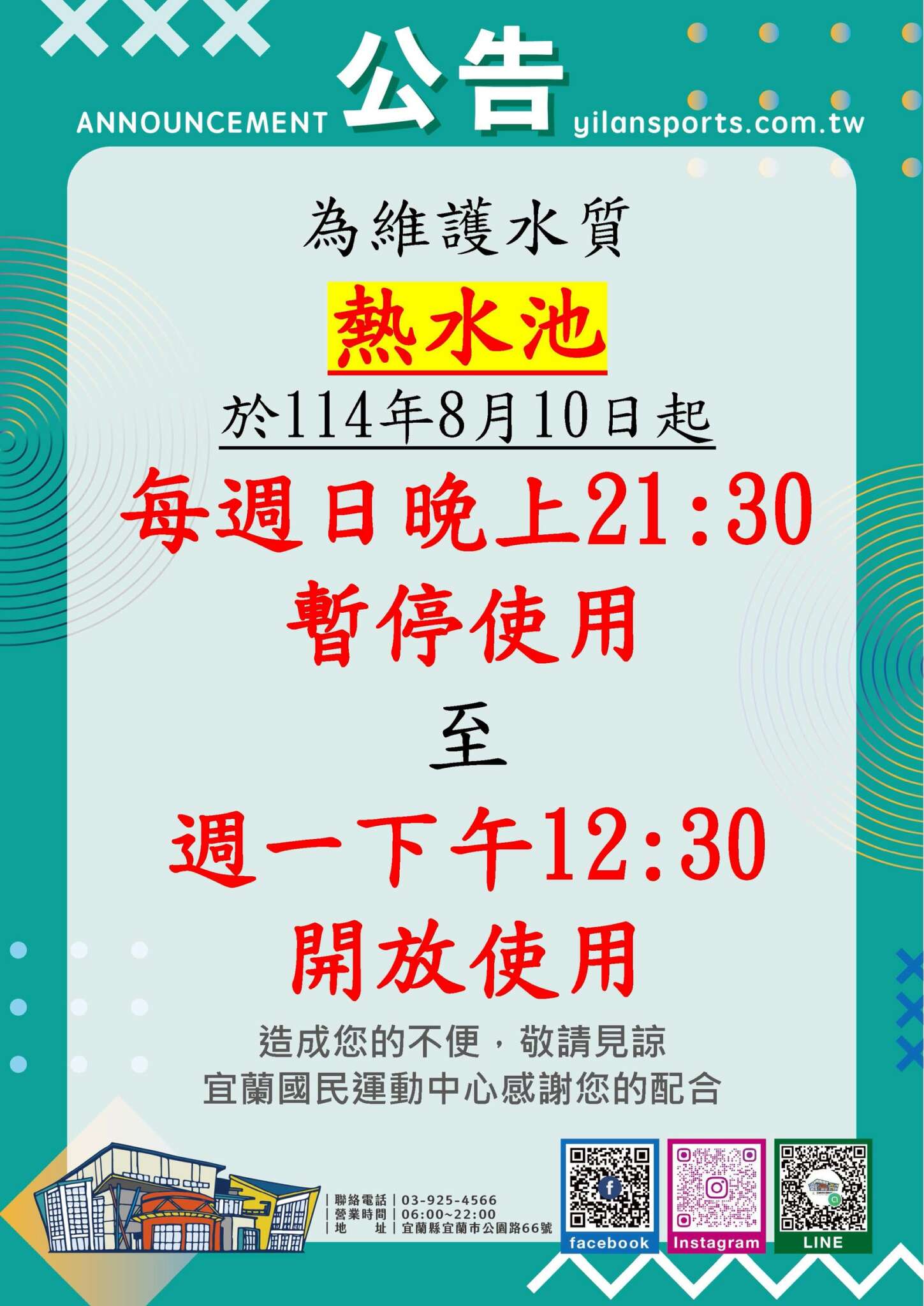 2025-08-02 宜蘭國民運動中心 in 最新消息 445 為維護水質 自114/8/10(日)起 每週日晚上21:30~至每週一下午12:30 暫停使用 維持每日泳池清場時間12:00-12:30