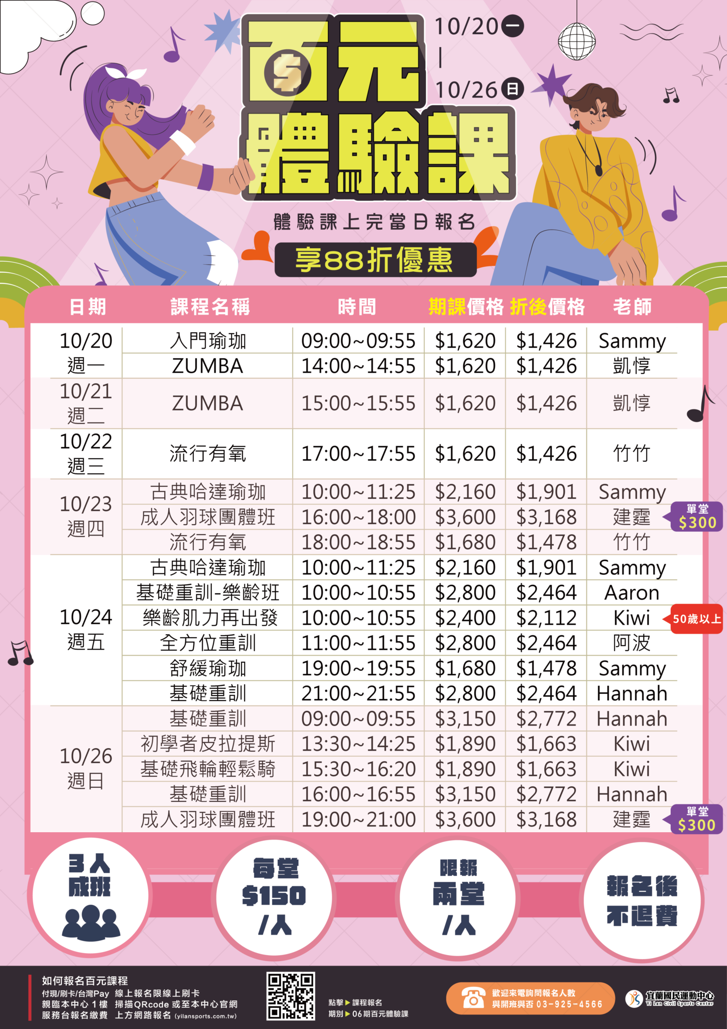 16 days ago 宜蘭國民運動中心 in 最新消息 252 沒在誇張每堂課 #只需150元 現在開始!省下三杯手搖飲料錢 𝟭𝟭-𝟭𝟮月全新登場運動課程搶先體驗 體驗當天報名期課 #享88折 我想報名體驗課程 一樓服務台臨櫃報名繳費 官網線上報名 ► https://reurl.cc/8WY4Ro ►期別選擇「06期百元體驗」 ►選擇欲體驗之課程 ►刷卡完成報名 小編暖心提醒 1.體驗課程開班後 #不接受退費 2.每人限報兩堂體驗課 3.期課報名88折優惠僅限體驗 #當日使用 4.所有優惠皆不得合併使用 更多優惠規則請詳閱海報DM 中心專線03-925-4566