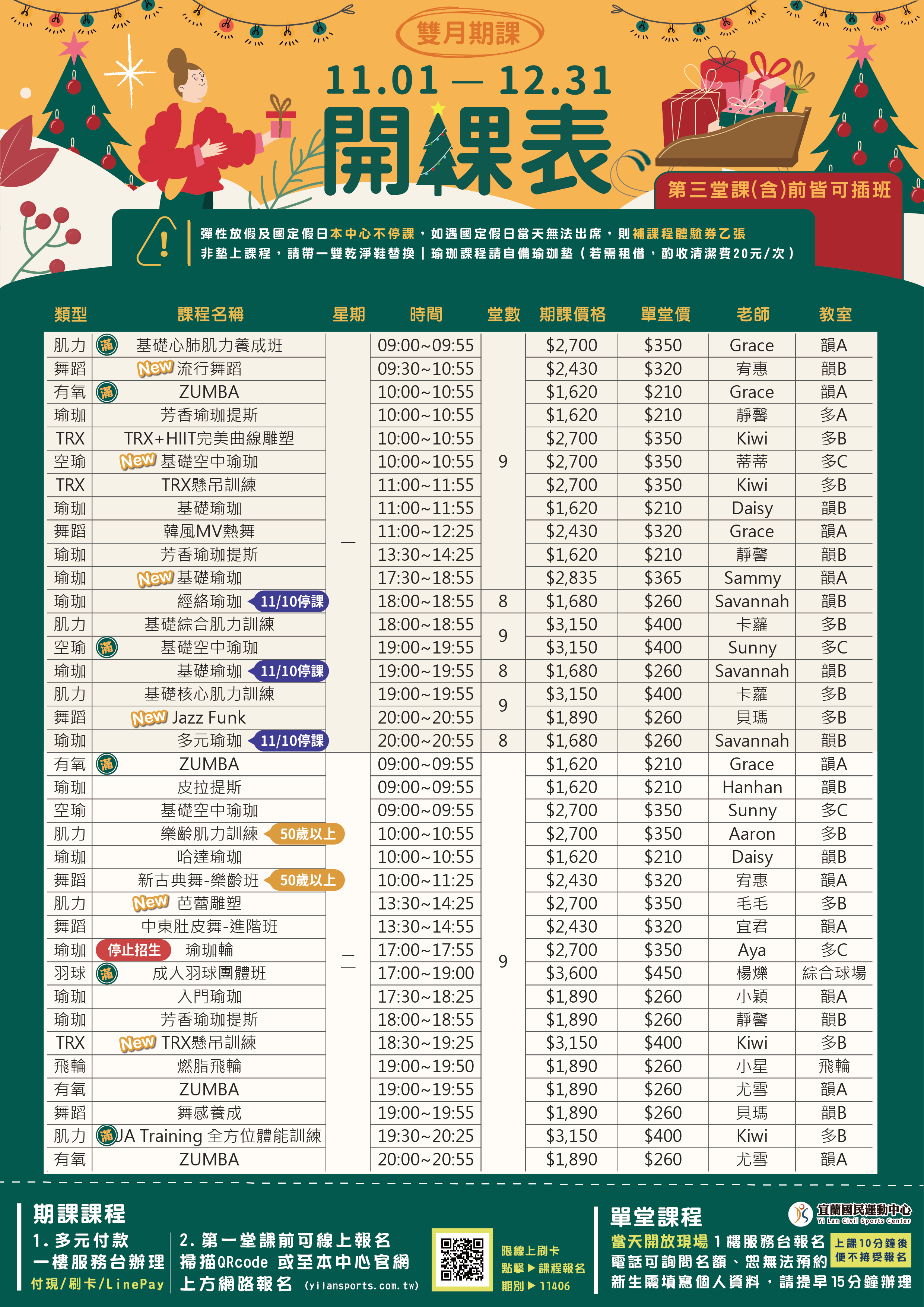 12 hours ago 宜蘭國民運動中心 in 最新消息 22 來看看有什麼新課程開課了呢 團班課程是運動新手的好選擇 馬上行動!別再為自己找藉口了! 𝟭𝟭/𝟮𝟭前 #開放插班報名! 無法固定時間上課?歡迎單堂體驗 高清開課表 ► https://reurl.cc/nlV9YD 插班報名請至一樓服務台報名 小編暖心提醒: 1. 未開班學員可使用 #相同折扣轉至已開課班級 2. 重訓團體班開放前三堂單堂體驗 3. 單堂課程僅限當天現場報名 4. 國定假日及彈性放假不停課