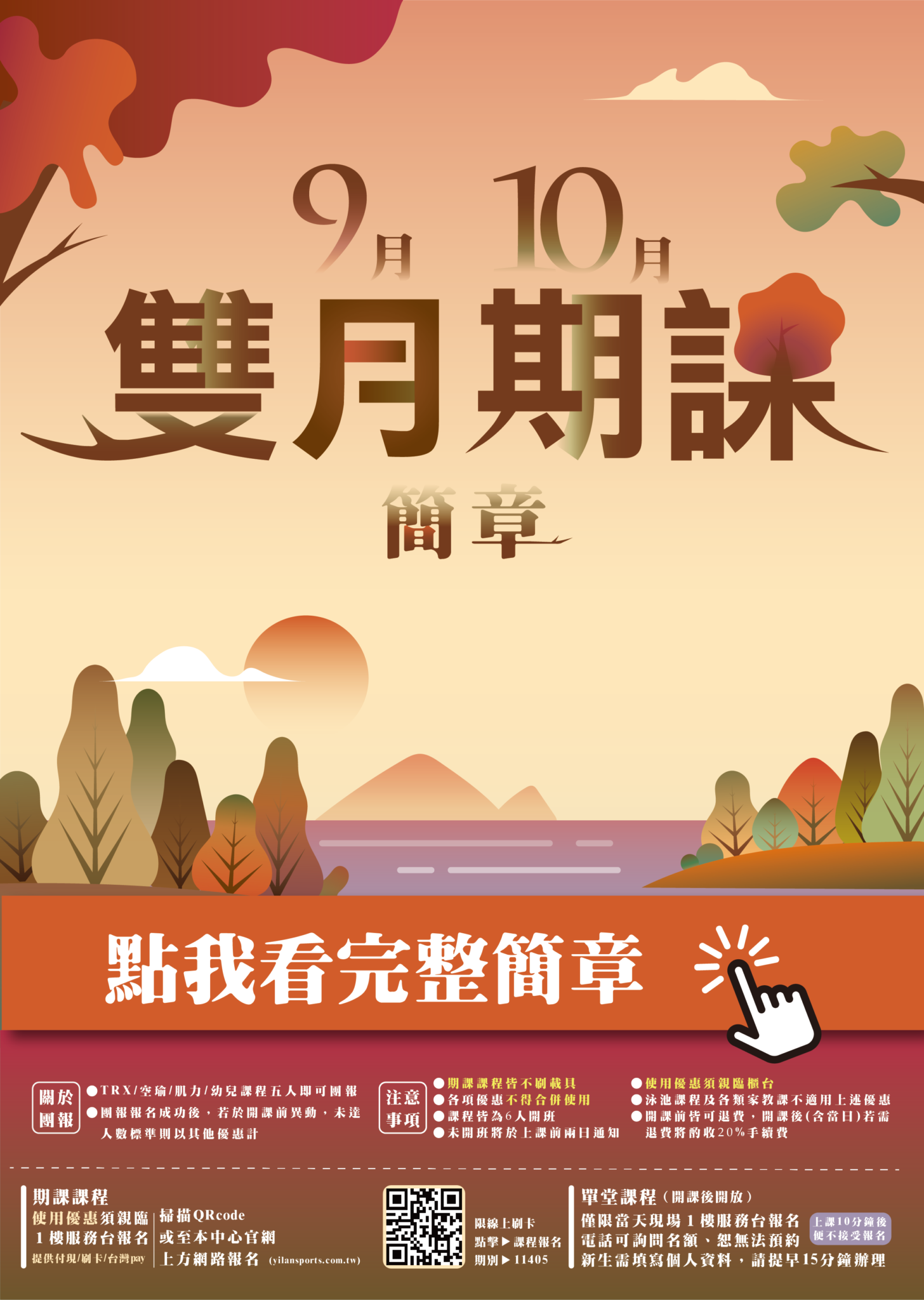 2025-08-12 宜蘭國民運動中心 in 最新消息 1195 中秋節=烤肉+月餅 但脂肪?我幫你「全部消滅」 • 早鳥優惠|8/13–8/19 |優惠一|六人團報價 8折 |優惠二|原班續報 85折 . • 晚鳥優惠|8/20–8/29 |優惠一|兩人 9折 |優惠二|四人 85折 . • 加碼好康| 8/20–8/29 |肌力課程|全面88折 . • 百元體驗週|8/19–8/26 只要 $150 搶先體驗期課 體驗當天報名期課再享 88折 • 報名方式 1. 臨櫃:中心1樓服務台 (現金/信用卡/Apple Pay/臺灣Pay) 2. 官網:https://reurl.cc/8WY4Ro → 選擇「11405」→ 線上刷卡 . 洽詢專線:03-925-4566Line社群|https://reurl.cc/51Vvrz